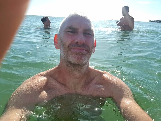 As I'm making my way back I realise there's a headwind, I feel my fast start might be catching up with me too which is confirmed when I run through my third kilometre in 3:34...uh oh! I'm starting to slow down and my brain starts telling me to bin it off and just go jump in the sea (not yet, shut up brain!). I have also passed Greg at this point who is looking strong also, definitely well within his 30 minute goal.